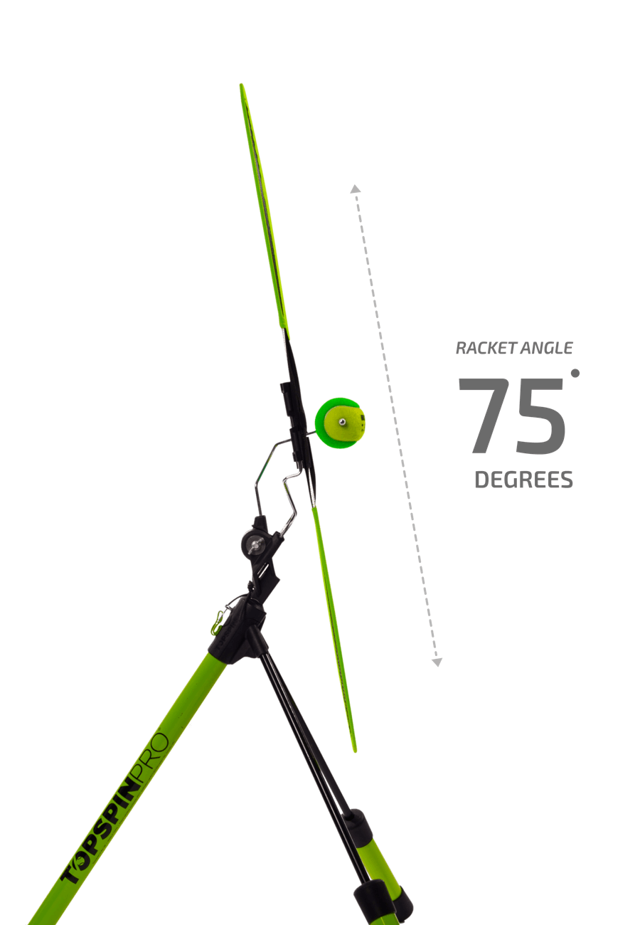 Federer's racket angle is usually 79 degrees and Nadal's is 76 degrees at the ball strike. TopspinPro temporarily removes the swing momentum in order to "lock in" the same biomechanics in your muscle memory. You automatically add the swing torque to your swing in practice and matches.
